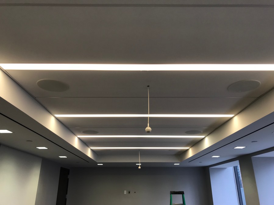 Our technician installing ceiling speakers in a conferenced room in NYC.